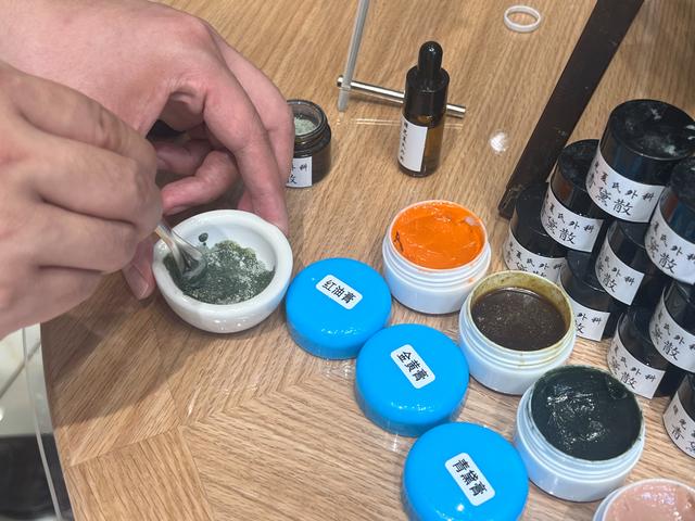 現場參觀不解渴,還能互動體驗?!肮繃煼ā?,夏氏外科傳統外治法之一,是將箍圍藥粉調制成糊狀的制劑外敷于患處。曙光醫院周紹榮主任現場調制演示“箍圍療法”,并贈予觀眾夏氏箍圍藥“青黛散”。