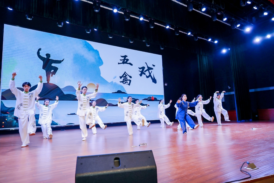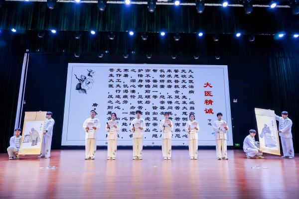 “華佗菁英班”培養對象代表領誦《大醫精誠》(節選)、國醫大師徐經世《華佗賦》(節選),同學們上臺展示醫祖華佗采藥、行醫、著書書畫作品,針灸推拿學院李斯亮老師和培養對象代表進行了華佗五禽戲表演。