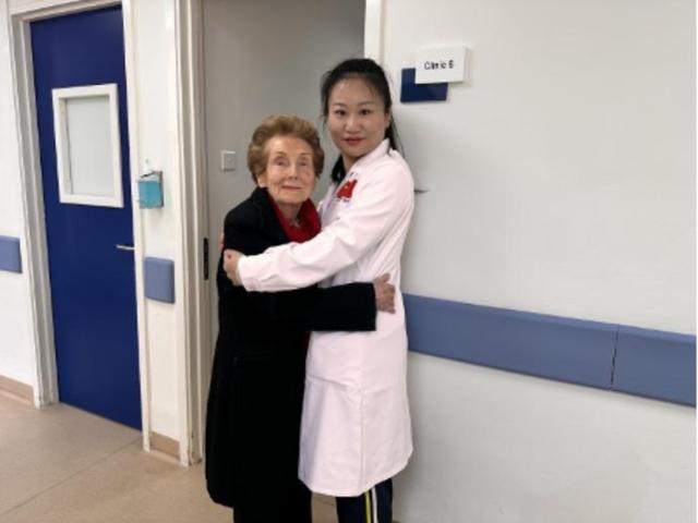 今年1月,索尼亞因為摔跤受傷,再次來到中醫科針灸。通過之前與患者的詳細溝通,高醫生已知老人獨自居住,兒子在國外工作,起居只有一名保姆照顧,因此除了給予針刺治療外,她還細致地向患者及其保姆進行了老年人防跌倒注意事項的宣教?!霸蹅円黄鹋膫€照吧,我要把照片發給兒子,讓他知道我被一位來自中國的甜心醫生照顧的很好?!彼髂醽喺f完就熱情地擁抱住高醫生,留下了這張溫馨的合影。