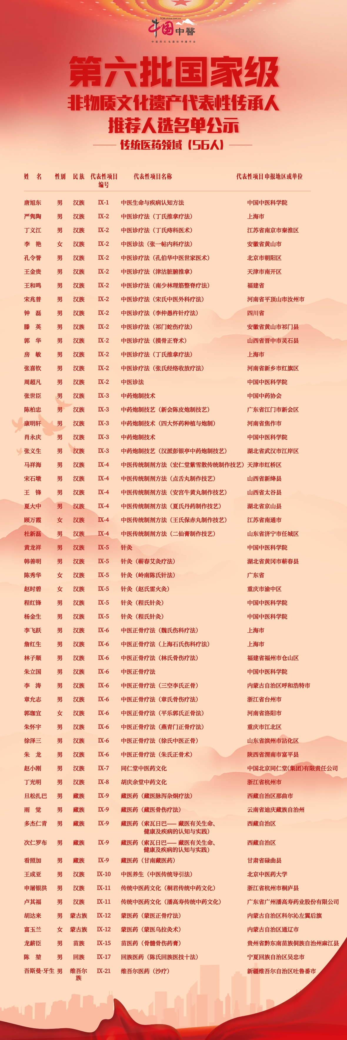第六批國家級非遺代表性傳承人推薦人選名單公示 ?56人入選傳統醫藥項目