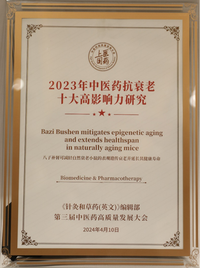 4月10日,第三屆中醫藥高質量發展大會在浙江烏鎮召開。多位院士專家學者、企業家代表參會,圍繞中醫藥高質量發展主題進行研討交流?!鞍俗友a腎可減輕自然衰老小鼠的表觀遺傳衰老并延長其健康壽命”研究在大會上被評選入“2023年中醫藥抗衰老十大高影響力研究”名單。