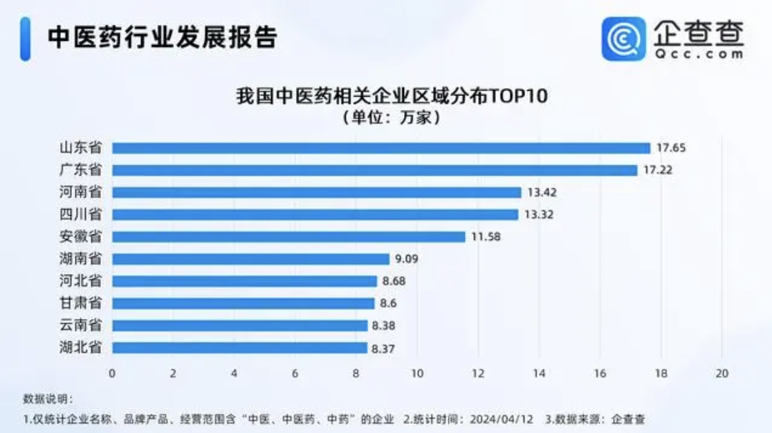 企查查數據顯示,從區域來看,山東現存17.65萬家中醫藥相關企業,位居第一。廣東緊隨其后,現存17.22萬家,位居第二。河南現存13.42萬家,位居第三。此后是四川、安徽等地。
