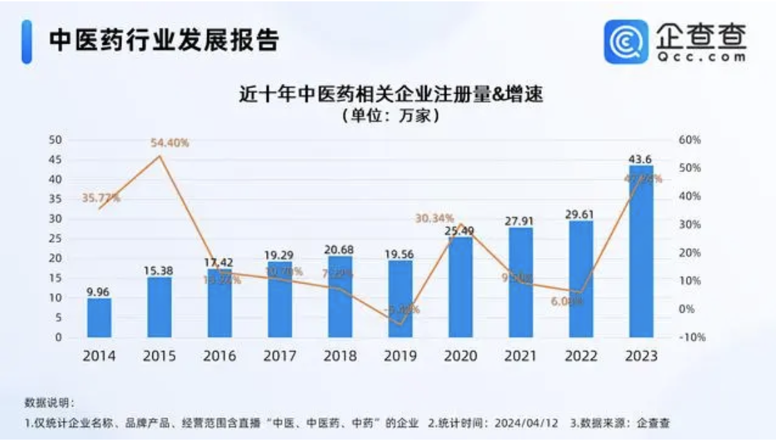 企查查數據顯示,國內現存中醫藥相關企業203.69萬家。近十年,其相關企業注冊量呈整體增長態勢,且增速差值較小。2023年其注冊量及增速迎來近五年雙峰值,首次突破40萬家,同比增長47.24%至43.6萬家。