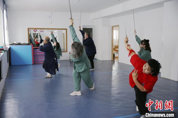 近日 在哈薩克斯坦首都阿斯塔納的一家健身房 武術愛好者亞歷山大(左一)在帶領朋友們練習太極劍