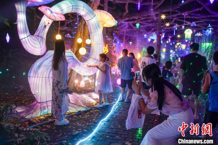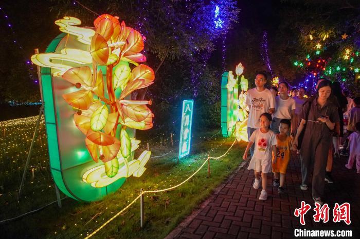 8月3日晚,廣西南寧,不少市民游客來到廣西藥用植物園觀賞中醫藥文化燈展?!八幱弥参飯@·光影奇妙夜”暨廣西藥用植物園第二屆中醫藥文化燈展近日在廣西藥用植物園舉行,游客可在奇幻光影間觀賞李時珍著書劇、非遺打鐵花、煙花瀑布等表演,感受中醫藥文化的浪漫。