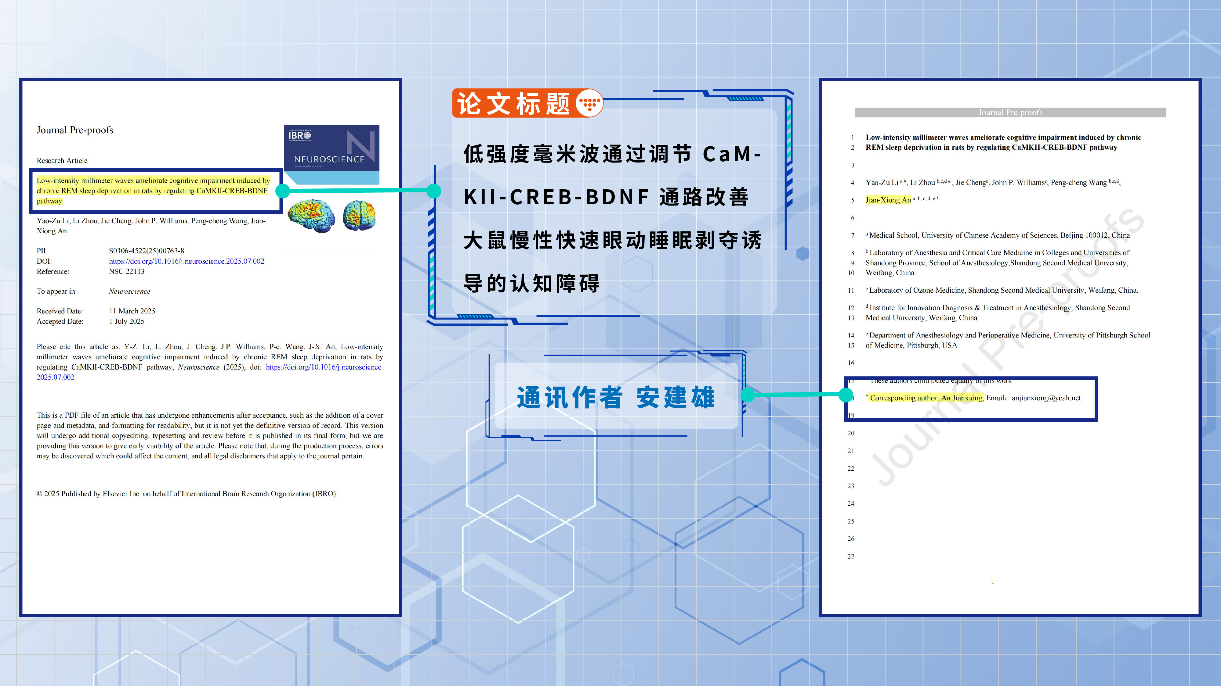 近日,百全毫米波臨床研究在睡眠醫學領域取得重大突破!知名專家安建雄教授及其團隊的研究論文《低強度毫米波通過調節CaMKII-CREB-BDNF通路改善大鼠慢性快速眼動睡眠剝奪誘導的認知障礙》,正式發表于SCI國際知名神經科學核心期刊《Neuroscience》(神經科學)。