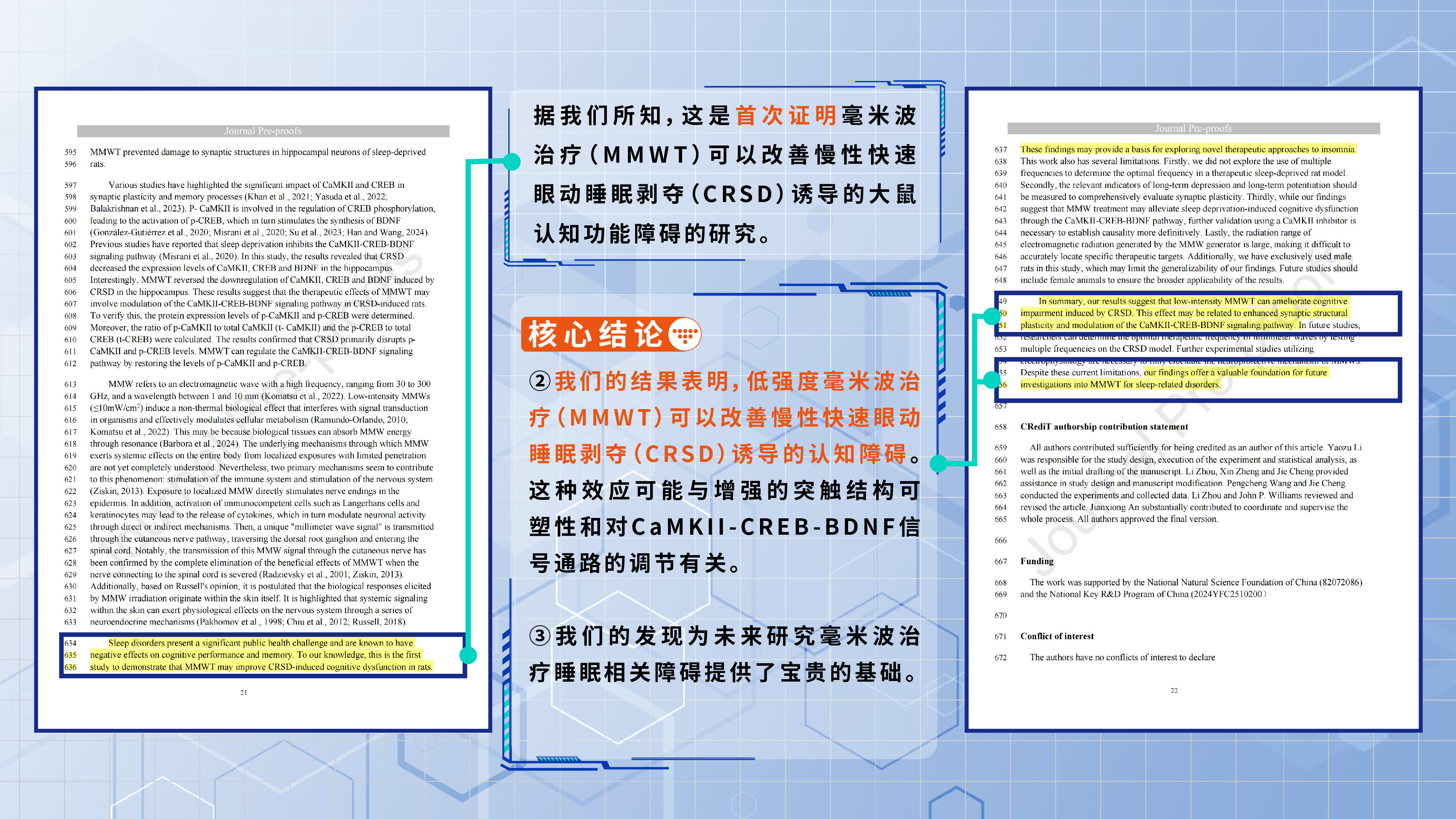 以詳實的數據得出核心結論:“低強度毫米波治療(MMWT)可以改善慢性快速眼動睡眠剝奪(CRSD)誘導的認知障礙。這種效應可能與增強的突觸結構可塑性和對CaMKII-CREB-BDNF信號通路的調節有關?!保ńY論源自論文原文)