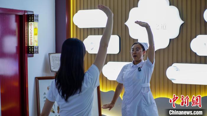 黑河市中醫醫院外科護士長黃冬妮(右)帶記者體驗八段錦 顏歆窈攝