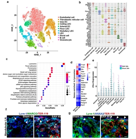 其三是找到核心靶點:對下頜淋巴結進行單細胞 RNA測序和免疫熒光分析后,團隊發現SAH后24小時,血管外紅細胞主要是被下頜下淋巴結髓竇LEC中的溶酶體蛋白酶S(CTSS)降解,以此顯著減輕蛛網膜下腔出血后的神經炎癥,并有效改善神經功能缺損。